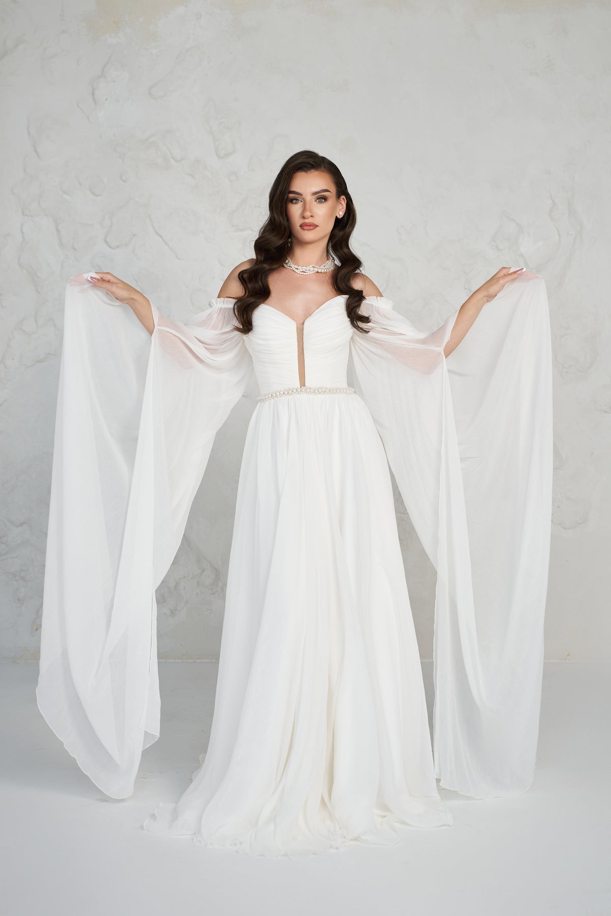 Un element important al rochiei Diora îl reprezintă mânecile tip capă din tulle, detașabile, care pot fi purtate sau îndepărtate, în funcție de moment. Acest detaliu schimbă vizual rochia și oferă două variante de purtare.